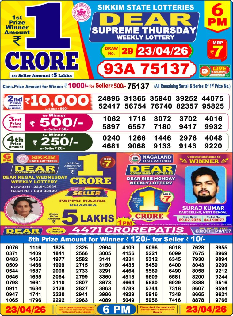 Dear Supreme Weekly Lottery 23.04.26 Draw Result Published here.