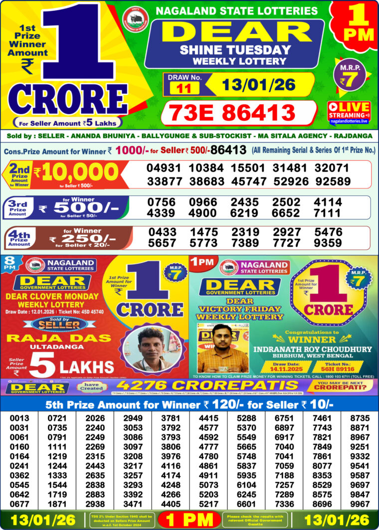 Dear Shine Weekly Lottery 13.01.26 Draw Result Published here.