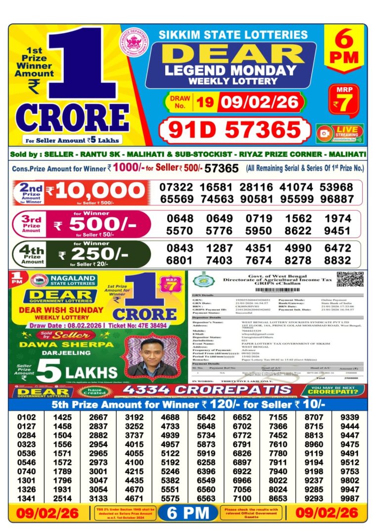 West Bengal Lottery Result 6PM 09-02-2026
